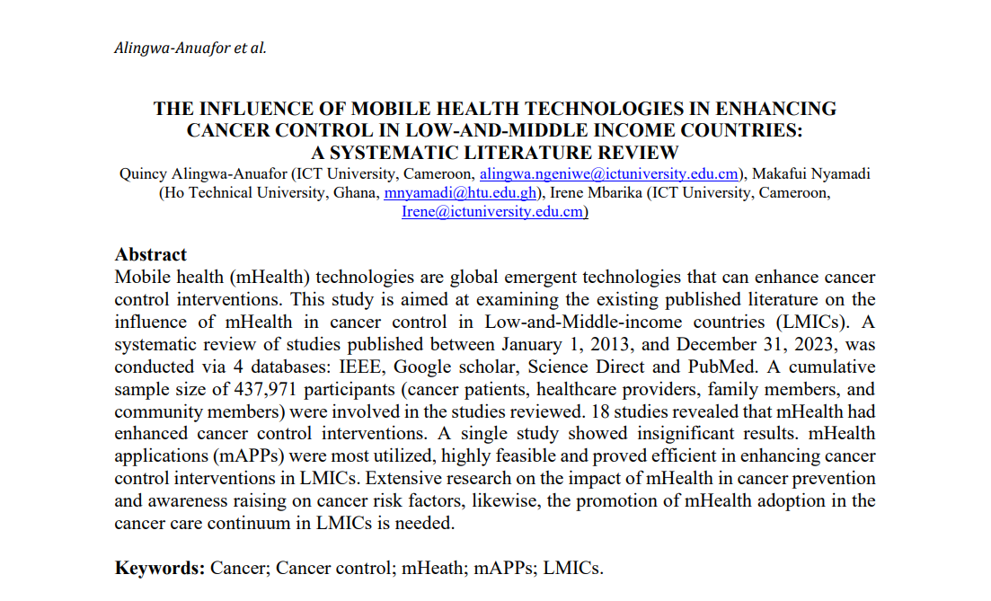 Mobile health (mHealth) technologies are global emergent technologies that can enhance cancer control interventions. This study is aimed at examining the existing published literature on the influence of mHealth in cancer control in Low-and-Middle-income countries (LMICs). A systematic review of studies published between January...